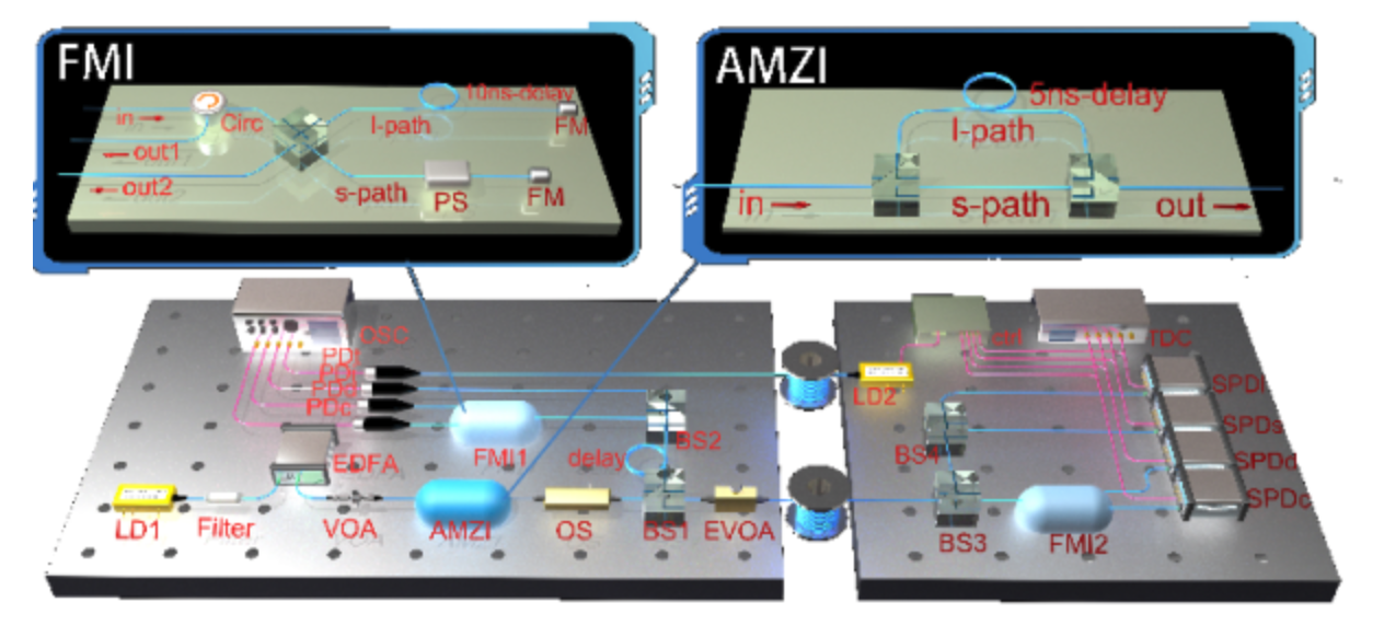 為徹底解決主動調(diào)制帶來的隱患,郭光燦團(tuán)隊(duì)與合作者另辟蹊徑,設(shè)計了無需主動調(diào)制的量子密鑰分發(fā)系統(tǒng)。該系統(tǒng)方案克服了此前無法同時實(shí)現(xiàn)“被動”光強(qiáng)調(diào)制和量子態(tài)編碼的矛盾,并給出了考慮“有限長效應(yīng)”的嚴(yán)格安全密鑰率。該團(tuán)隊(duì)通過全被動時間戳-相位編碼解決信道環(huán)境干擾的難題,同時通過優(yōu)化后選擇策略解決數(shù)據(jù)吞吐量過大的難題,最終完成了無需任何主動調(diào)制的量子密鑰分發(fā)系統(tǒng),驗(yàn)證了全被動量子密鑰分發(fā)的安全性與可行性。