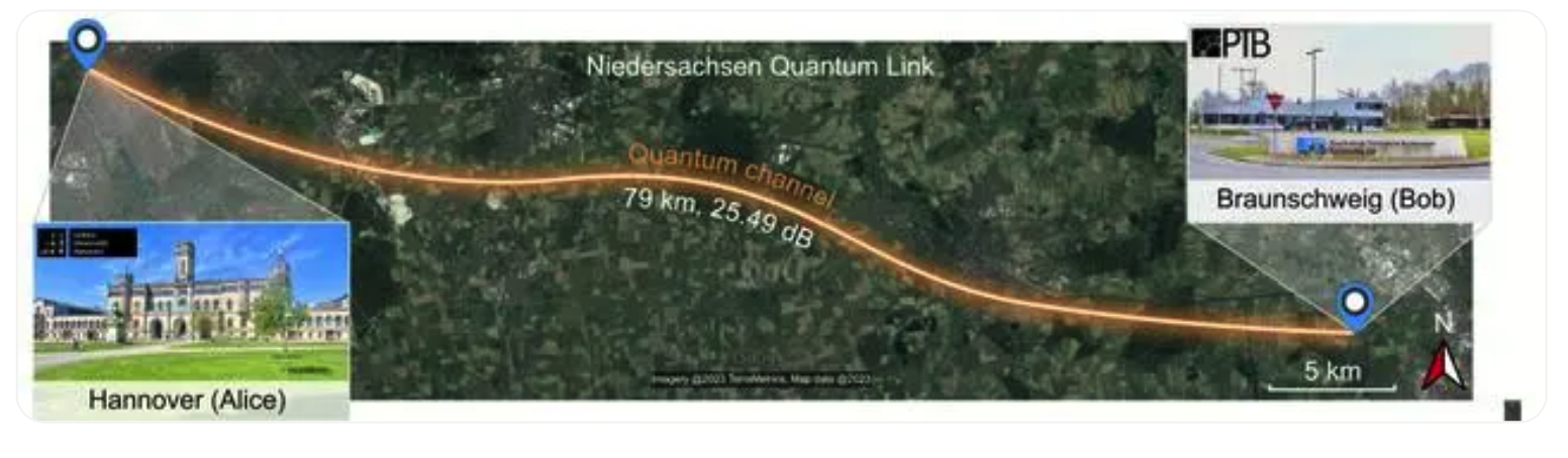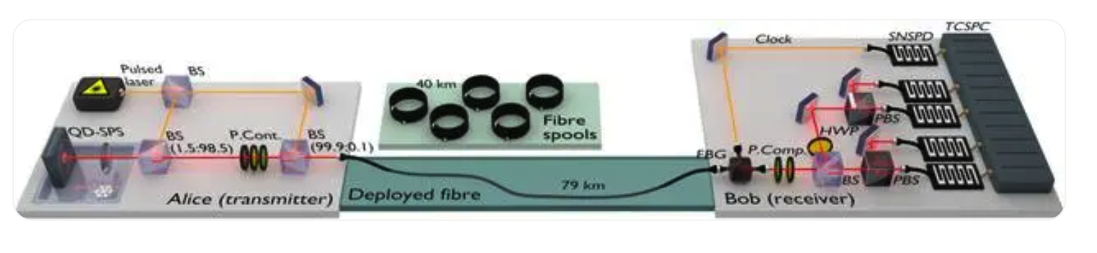 然后,通過長達(dá) 79 公里的城市地下光纖,傳送到 Stefan Kück 實(shí)驗(yàn)室實(shí)現(xiàn)密鑰解碼,雙方通過測量基對比的過程完成安全密鑰的共享,進(jìn)而可以使用量子安全密鑰實(shí)現(xiàn)了對于經(jīng)典信息的加密。