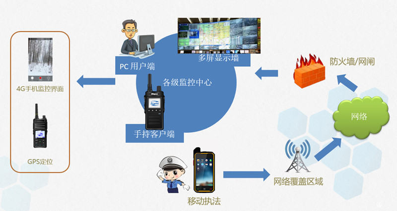 用戶通過集群調度管理平臺進行用戶管理、群組管理、設備管理對終端對講機進行設置后,根據對講協(xié)議和數據及時完成視頻交換,將多個對講終端互聯(lián)互通,實現(xiàn)單戶、組呼、搶話語權、視頻對講等一系列的遠傳功能,同時通過平臺結合業(yè)務需求對對講終端進行查詢、跟蹤、分析等功能。